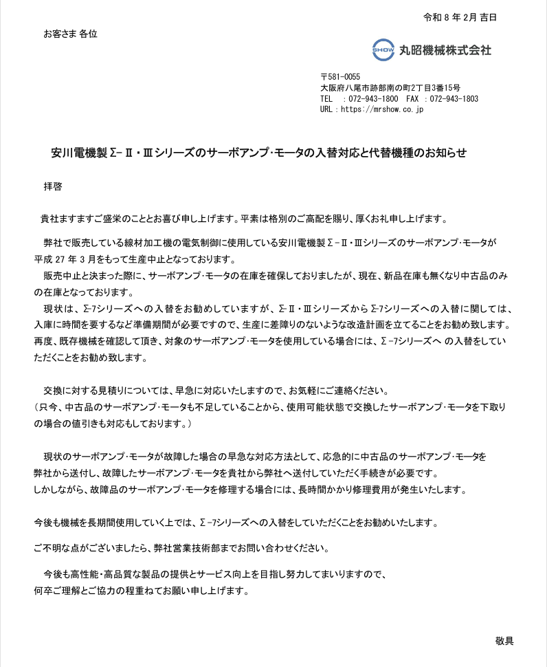 安川電機製Σ-Ⅱ・Ⅲシリーズのサーボアンプ・モータの入替対応と代替機種のお知らせ